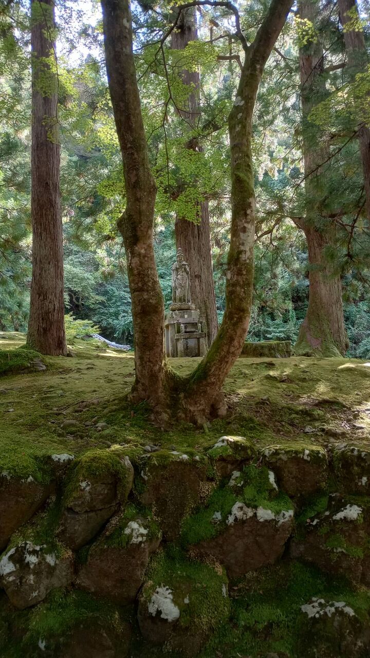 緑に囲まれ川の音が聞こえる中に、仏像が建ってたり